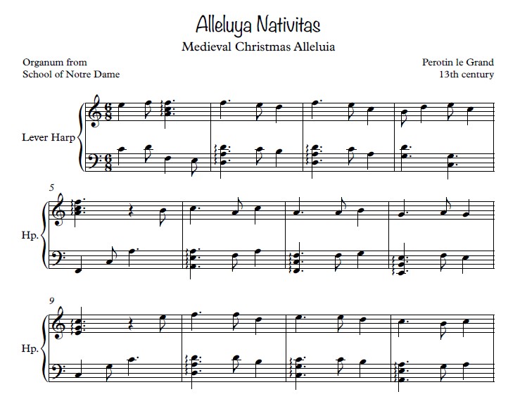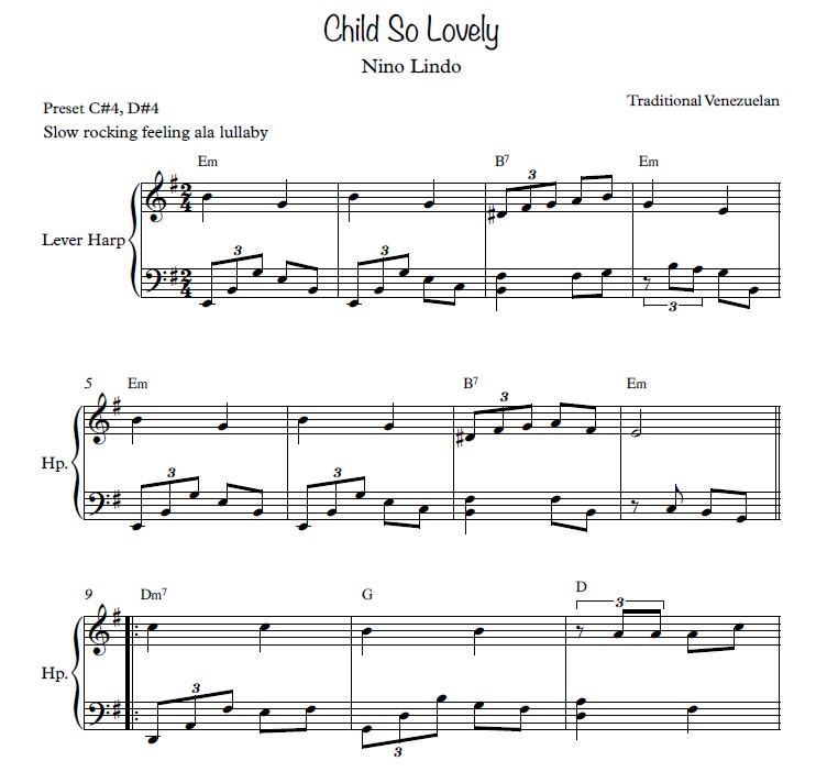 “The International Christmas Harp is a collection of 24 carols and songs from various international Christmas traditions from the Medieval period to the present and including music of Europe, Asia and the Americas. The arrangements are appropriate for a large lever harp with 2 octaves below middle C and tuned to Eb or C. Songs in two tunings are noted with an * in Contents. The songs are very accessible and appropriate for mid-beginner to intermediate players with limited or easy lever changes.”