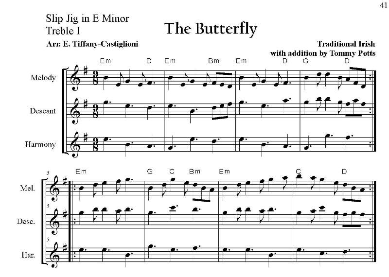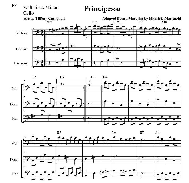 2, and 3. Harp 1 can be used as a solo. The music for melody, descant, and harmony is given in 3 versions: Treble I (flute range), Treble II (mandolin or C clarinet range), and Cello (bass clef).