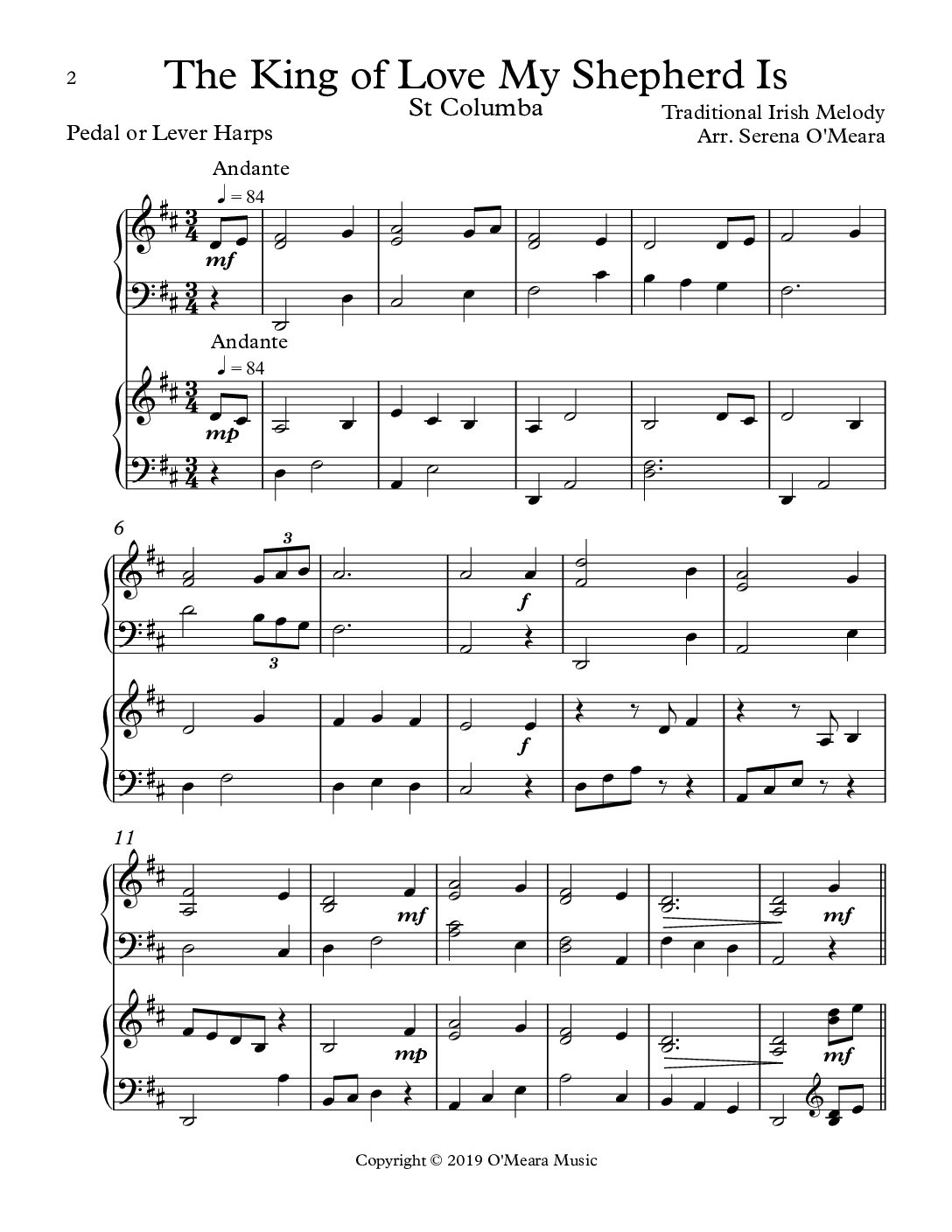 This expressive Celtic melody is arranged with 4 verses. The third verse is B.D.L.C in a lower octave. The fourth verse has lush, rolled chords. It is set in the key of D with the melody shared equally between parts. Each part is of equal difficulty. Dynamics are clearly marked. Score & Parts, 12 pages.