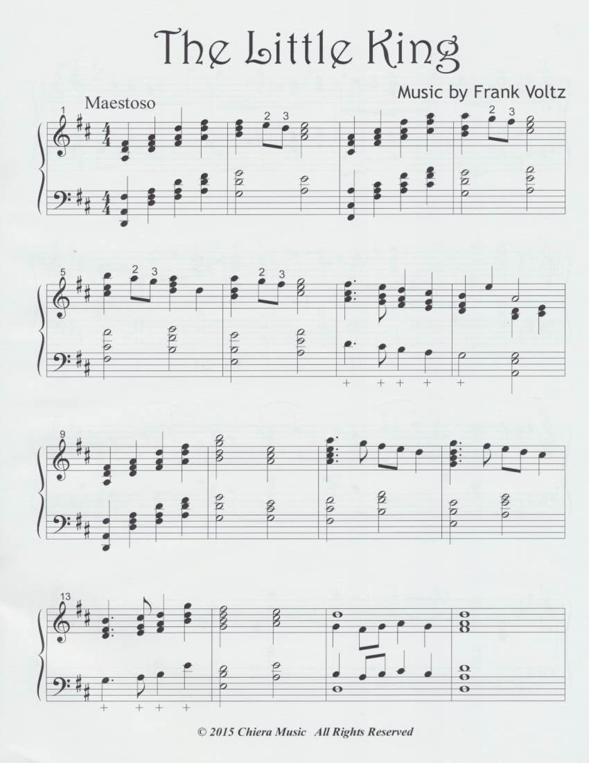 If you enjoy Frank’s Gloria and Entrada marches, you’ll love this one. It is much easier than those pieces. Mostly three-note chords, hands imitate each other, seven easy lever changes. Key of D major, perfect for December’s Advent/Christmas season. Try it as a new showcase piece for the march of the Three Wise Men for Epiphany. Also suitable for wedding processional/recessional, prelude, or special music.