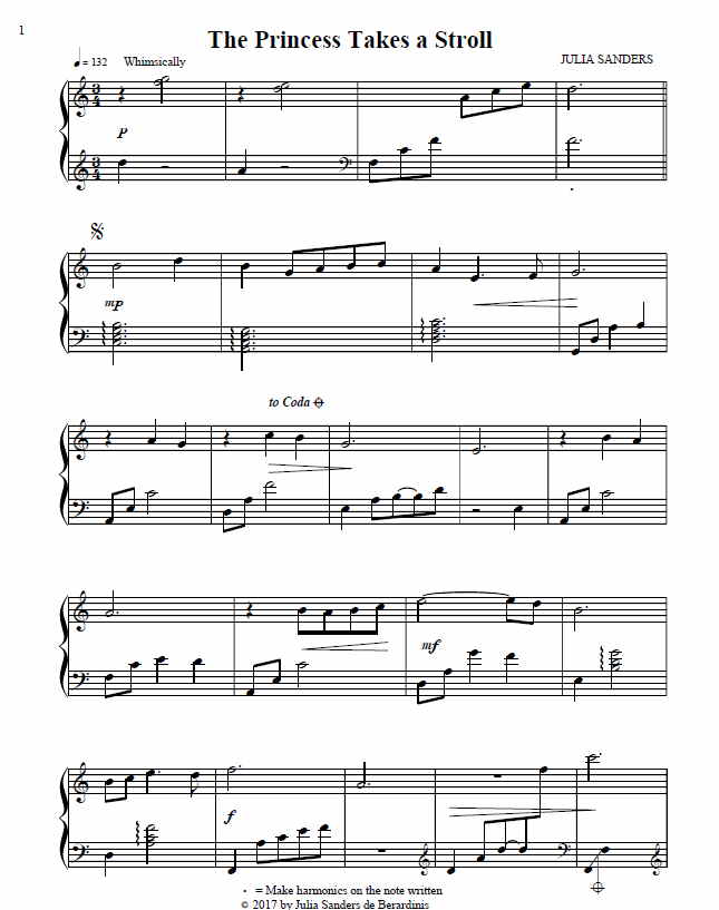 This charming, lilting waltz has the princess dancing and singing on her walk with the aid of harmonics, muffles, and glissandi. Three pages, key of C, and no accidentals.
