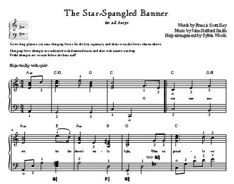 Sylvia Woods has made two harp arrangements of The Star-Spangled Banner. The first version, in the key of C, can be played on lever or pedal harp. If your lever harp is tuned to the key of C, this is the version you should play. The second arrangement, in the key of B-flat, is for lever harps tuned to flats or pedal harps. B-flat is the key that is most commonly used when the song is sung.