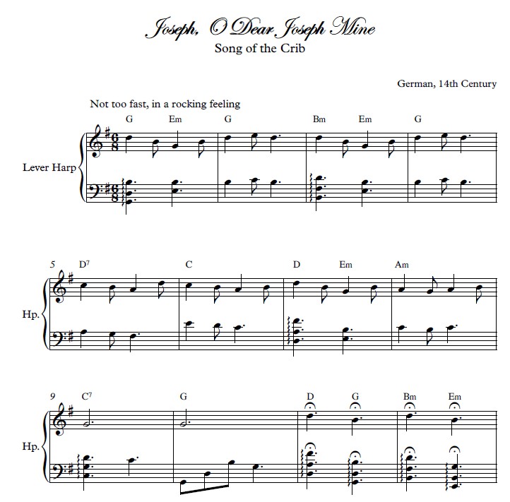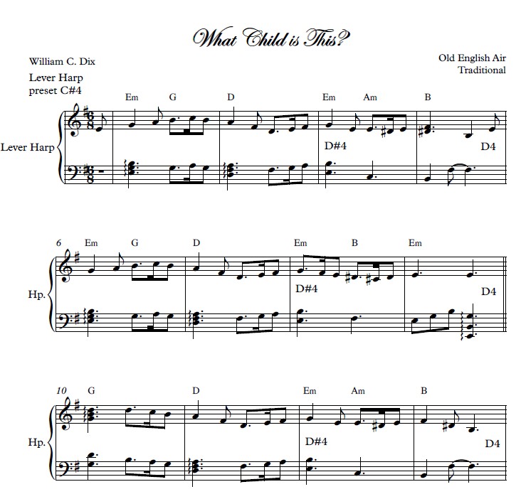 “The Traditional Christmas Harp is a collection of 23 popular carols and songs from various European traditions. Most of the songs will be familiar, but a couple might be new. A couple of them would be appropriate for a Christmas Concert such ‘O Holy Night’ or the ‘Pastoral Symphony’ from Handel’s Messiah. The arrangements are appropriate for a large lever harp with 2 octaves below middle C and tuned to Eb or C. Songs in two tunings are noted with an * in Contents. The songs are very accessible and appropriate for mid-beginner to intermediate players with limited or easy lever changes.”
