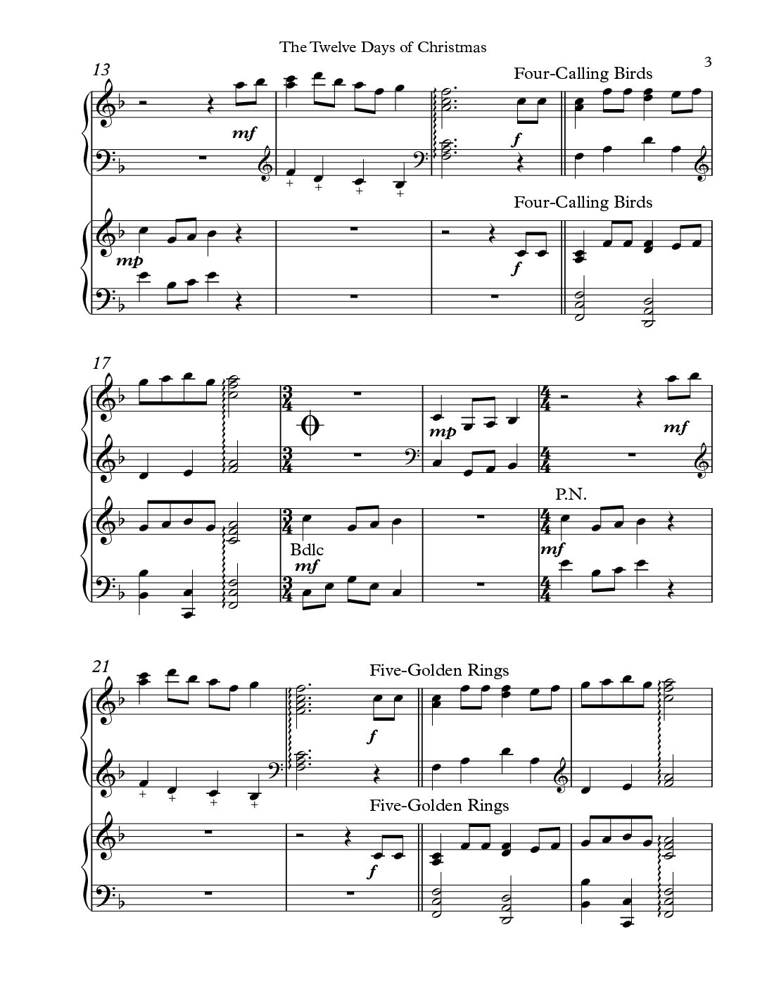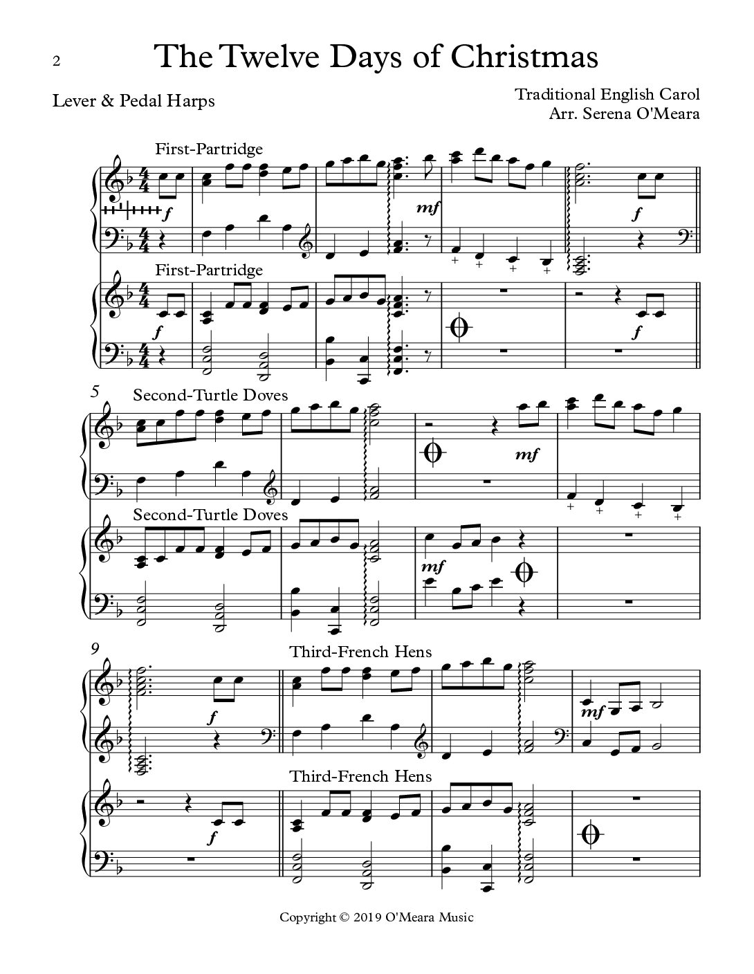 Energy abounds in this holiday favorite. To demonstrate sound effects on the harp, included are harmonics, glissandos, sons xylo, etouffee, PDLT, BDLC, and knocking. Dynamics are clearly marked. Be aware of clef and speed changes. Lever/pedal changes clearly marked in Harp I. You will receive the Score, Harp I, Harp II and a beginner’s melody part with all the lyrics, 30 pages.
