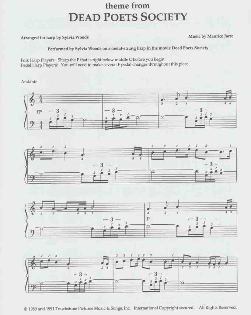 Sylvia Woods performed this piece on a metal-strung harp for the movie soundtrack. Key of C with F# base accidental that occurs throughout the piece. Soundtrack by Maurice Jarre.  Written for “Dead Poet’s Society” movie in 1989.