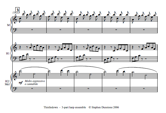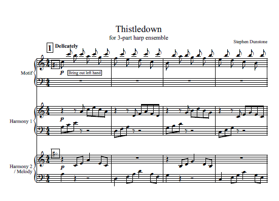 Thistledown is based on a simple and familiar chord progression. It has a descending scale sequence that suits the harmony. Dunstone’s version is an easily manageable descending scale motif. It has a lovely new melody introduced in measure 15.