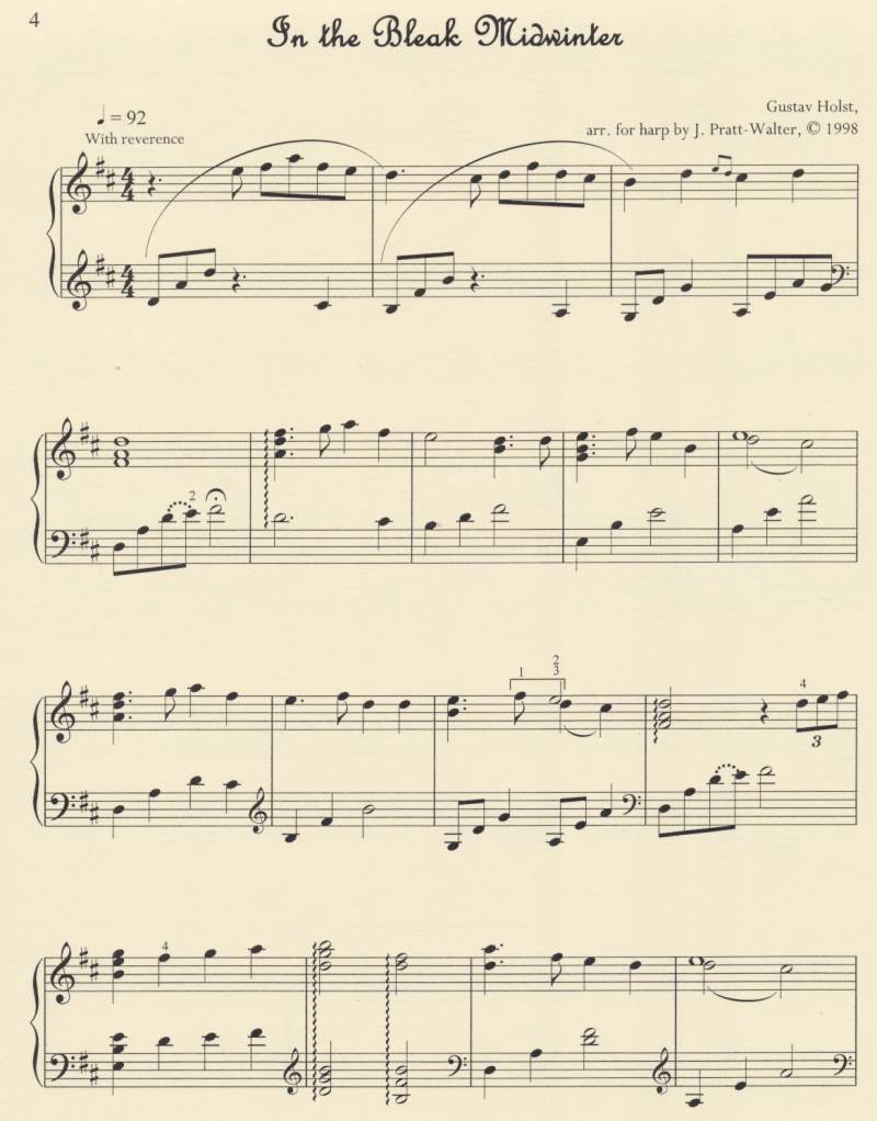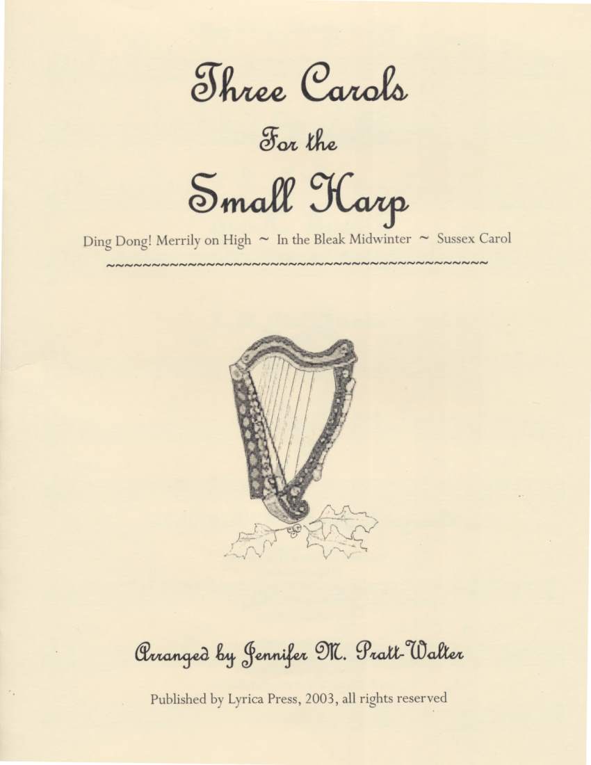 Simple, melodic and engaging arrangements of Ding Dong Merrily on High, In the Bleak Midwinter and The Sussex Carol will compliment your holiday repertoire. Crafted to fit a harp going down to C below middle C, the advanced beginner and up will enjoy these arrangements incorporating drones, triads, counter-melody and more. Up to 2 sharps and no lever changes. Lead sheets are also included. Seven pages.