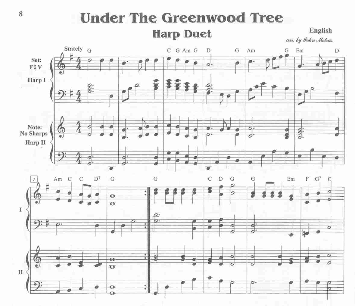 The arrangements in this book are selected from the rich repertoire of pieces written in the 16th C and used in Shakespearean plays. There are pullout parts for harp 1 and 2. Bound within the book are the score for each selection with chords, followed by the individual parts with fingerings. These are the same parts as found in the pull-outs, but they contain fingering suggestions. The arrangement of Under the Greenwood Tree is written in two different keys with Part 1 having the melody on the first page and Part 2 on the 2nd page. Each of the twe melodies can be used as a separate solo. The same goes for When That I Was And a Little Tiny Boy. These are full and stately arrangements, nicely edited. INTERMEDIATE, ALL HARPS.