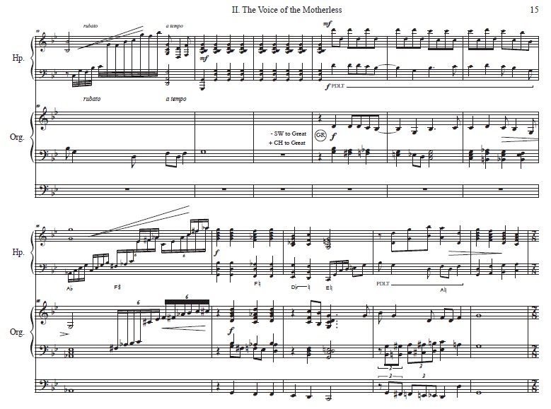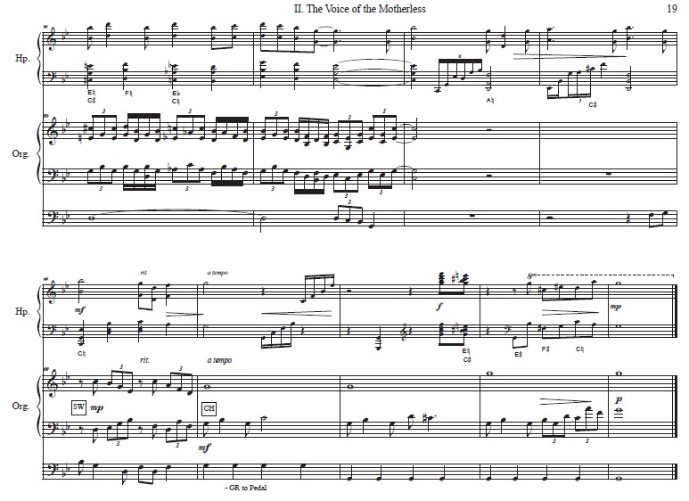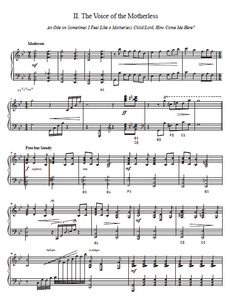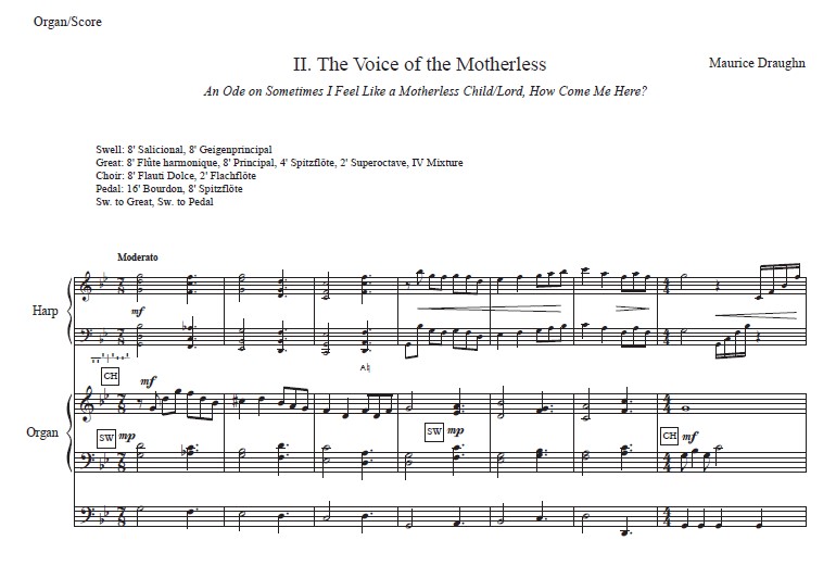 Two familiar spirituals coalesce in “The Voice of the Motherless.” The opening passage is in septuple meter, portraying the unsettledness of displaced children. Sometimes I Feel Like a Motherless Child is played on the harp while juxtaposed by the refrain from Lord, How Come Me Here on the organ. The verse from the latter is played on the organ to represent the voice of mothers forcibly separated from their children. As the movement advances, there is a sense of drama and grief as the complexity of the harmonic progressions intensifies. The concluding cadence represents the lone voice of the motherless.