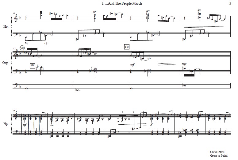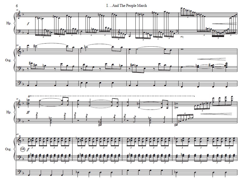 The first movement “…And the People Marched” depicts the events surrounding the Poor People’s March. The call for the march is heard in the opening fanfare which is intoned with pitches representing the surname KING. A conversation follows in a call and response between the harp and organ. The harp then introduces the thematic material, which extends into the organ, conveying the momentum of the movement. A brief harp cadenza foreshadows the assassination of Dr. King, which is signaled by a thunderous effect in the harp. The ensuing civil disturbances are depicted in the cataclysmic sounds of the gushing chords on the harp and the militant march played on the organ. A new melodic line symbolizing the continuation of the campaign rises from the organ as the intensity of the militant march wanes in the harp. The piece ends with an homage to the construction of the