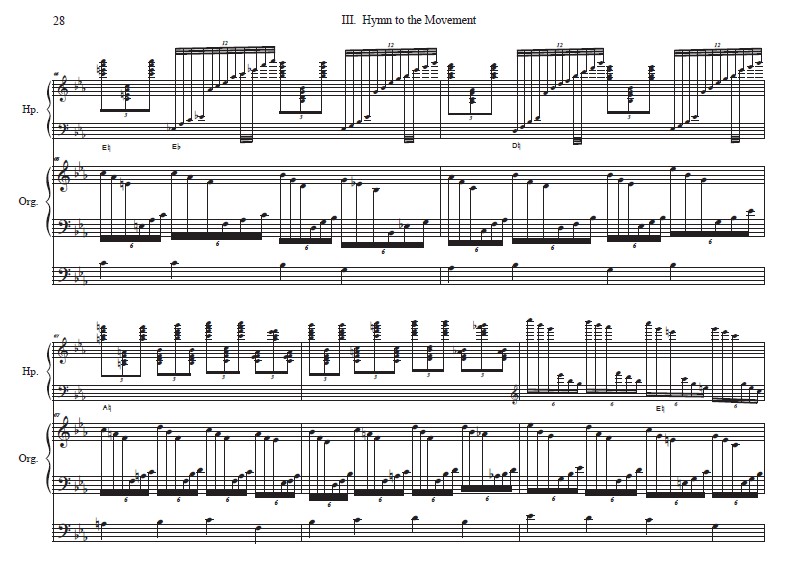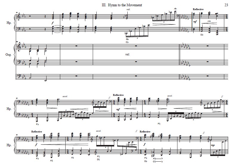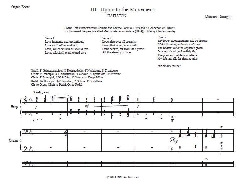 The final movement of this work contains a newly composed hymn tune – HAIRSTON. The tune is based on the writings of Charles Wesley. The movement begins with a stately introduction by the harp followed by a chorale setting of the hymn performed on the organ. A harp interlude is interjected between the opening and concluding stanzas. The movement culminates in the style of a toccata featuring the organ with harp embellishments.