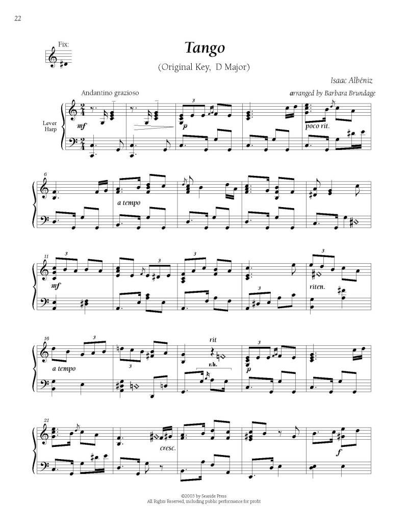 This is a collection of music arranged for lever harp tuned to Eb. Intermediate to advanced difficulty. These are pieces often requested during background music jobs. Audiences will be pleased to hear well known favorites. Lever changes are well marked. These are not easy, but the full and correct harmony is retained. Although these could be played on the pedal harp, this repertoire already exists for that instrument. We recommend that this be purchased if you want to learn, play and perform this excellent repertoire on your lever harp. ADVANCED, ALL HARPS.