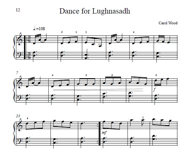 Lughnasadh, on August 1st, is the festival of the first harvest. A version of the name of this festival survives in Manx and Scots Gaelic as well as in Irish Gaelic, and the name itself derives from Lugh, one of the most important Celtic gods. The Puck Fair of County Kerry, with its horse market, music, and dancing, was almost certainly a continuation into the 20th century of Lughnasadh, and so for this holiday I composed a dance that is almost, but not quite, a traditional jig.
