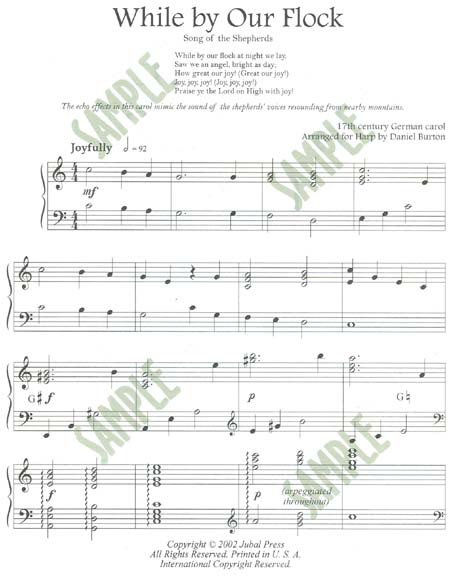 Here is a joyous seven-page arrangement of this 17th C German carol, featuring the sounds of the shepherds’ song and its echo from the neighboring mountains. Written for pedal harp, it can be adapted for 29 or 30-string lever harp. Lower intermediate level. Open harmonies, mostly quarter notes and half notes, with a majestic eighth note ending. INTERMEDIATE PEDAL HARP