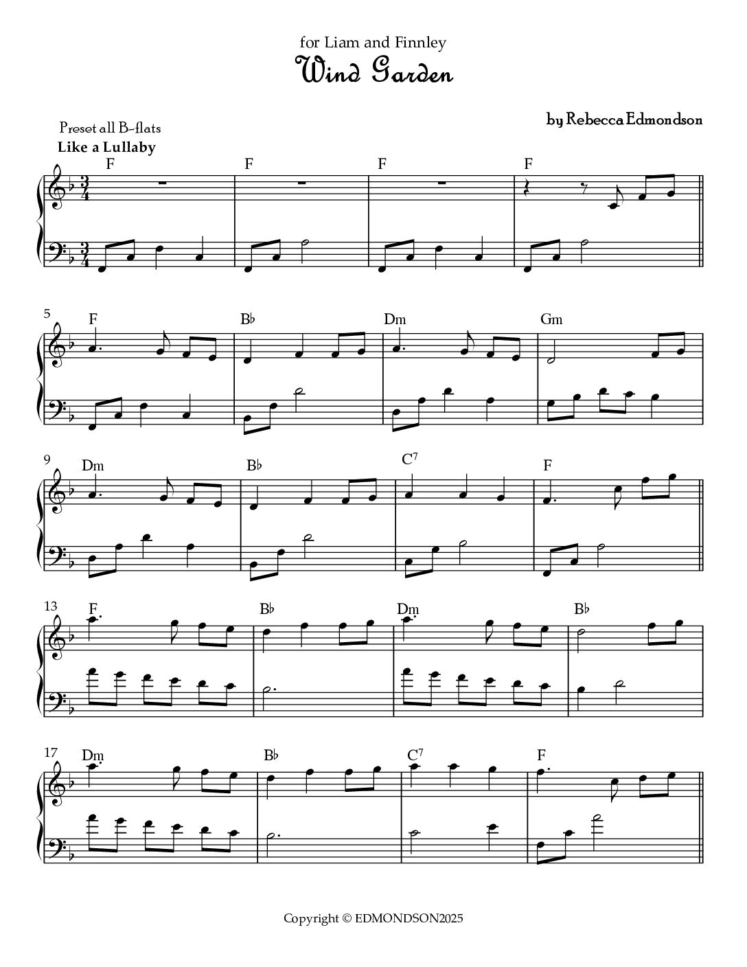 Wind Garden is a relaxed tune in 3/4, reminiscent of a lullaby. The sweet melody invites the listener into a garden filled with the aroma of lavender. It paints a picture of children running along the moss-covered stones. A gentle breeze provides sweet sounds from the hanging chimes, which inspired this lovely tune. Advanced beginner lever – 3 pages