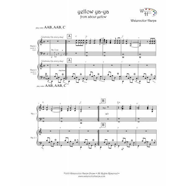 Harp 1 supplies the joyful melody while Harp 2 provides the energy. Harp 2 part has slap bass for added effect but player’s choice. The solo combines the parts in two hands.