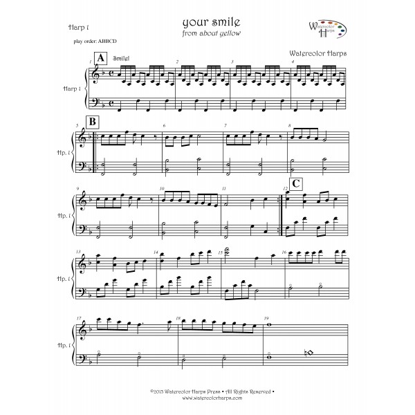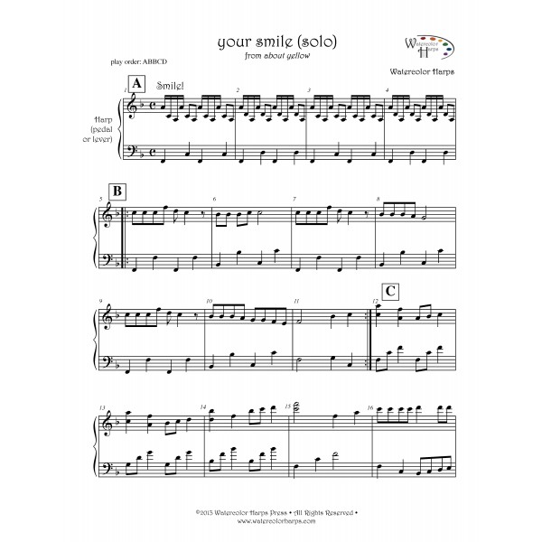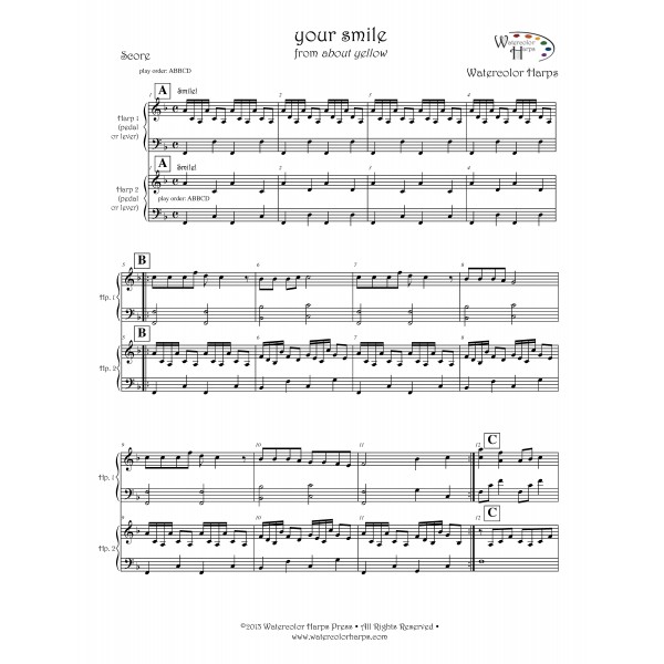 Contains score for the duet version, harp 1, harp 2, and the solo version. Plus performance notes. Click to hear sound clip.  https://soundcloud.com/watercolor-harps/your-smile-clip