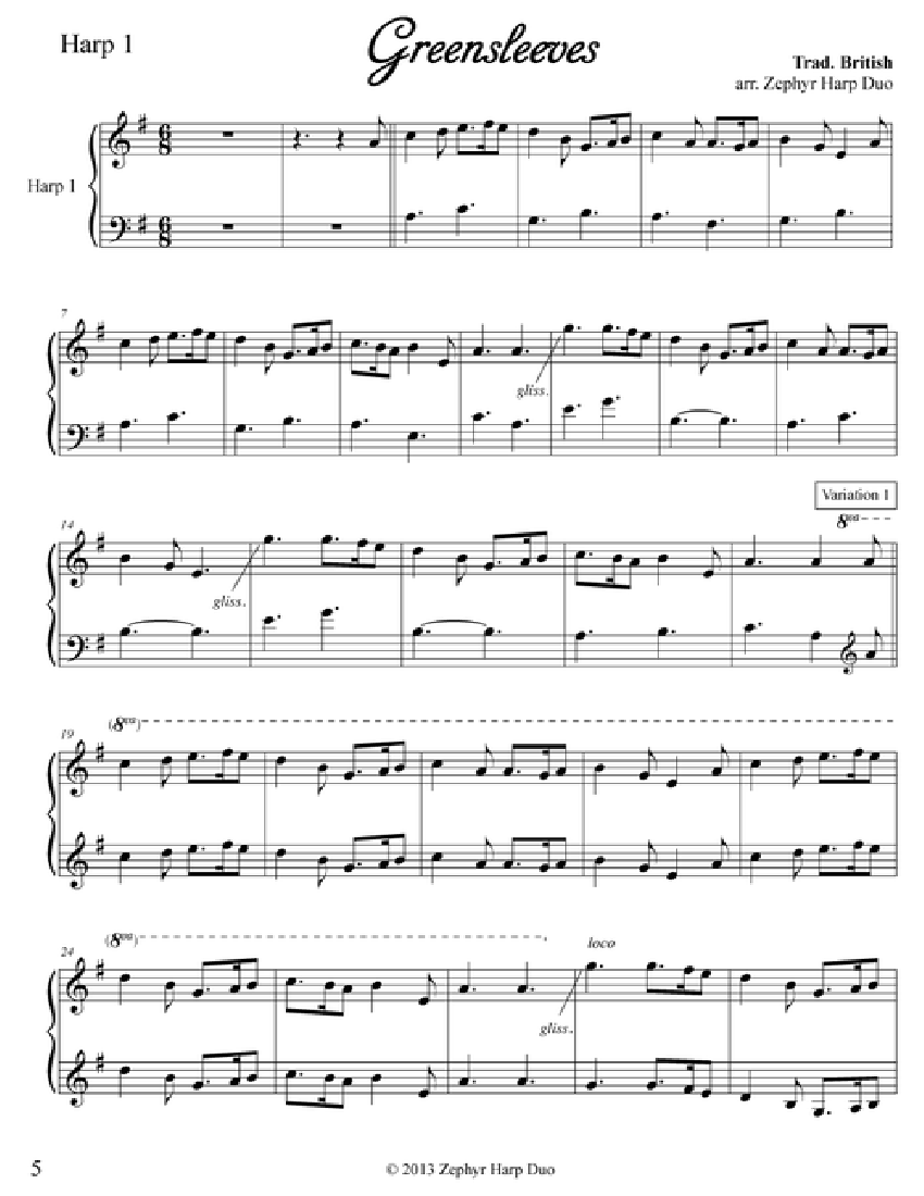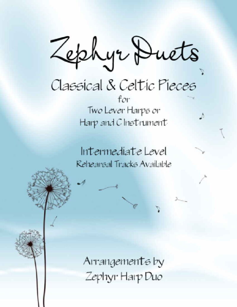 This is a book of duets arranged by the Zephyr Harp Duo for two lever harps or harp and C instrument. The collection of seven Classical and Celtic Pieces at the Intermediate Level are duets from the duo’s general repertoire. Rehearsal tracks for both Harp 1 and Harp 2 are included with this purchase as MP3s.